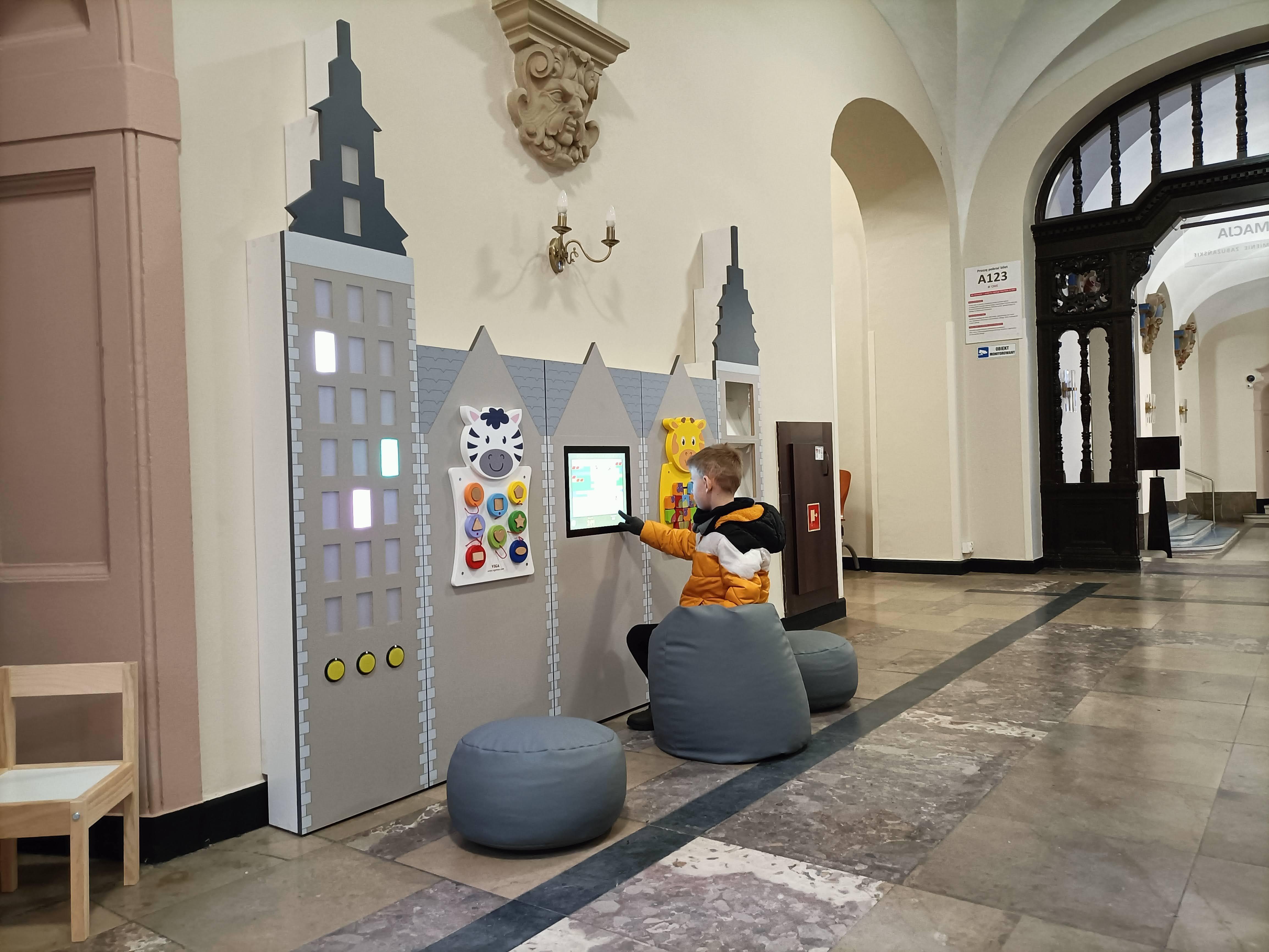 Kącik wyposażony jest w ekran dotykowy z grami edukacyjnymi, grę ćwiczącą refleks, dwie duże drewniane zabawki manualne oraz regalik na książki. A to wszystko ubrane w kształt nawiązujący do fasady budynku.